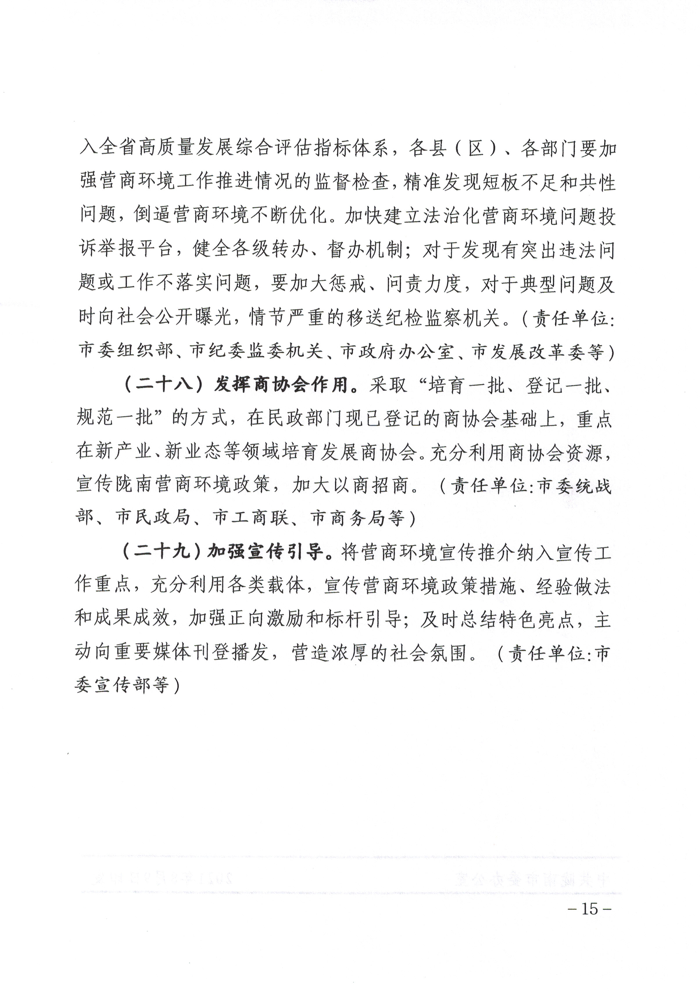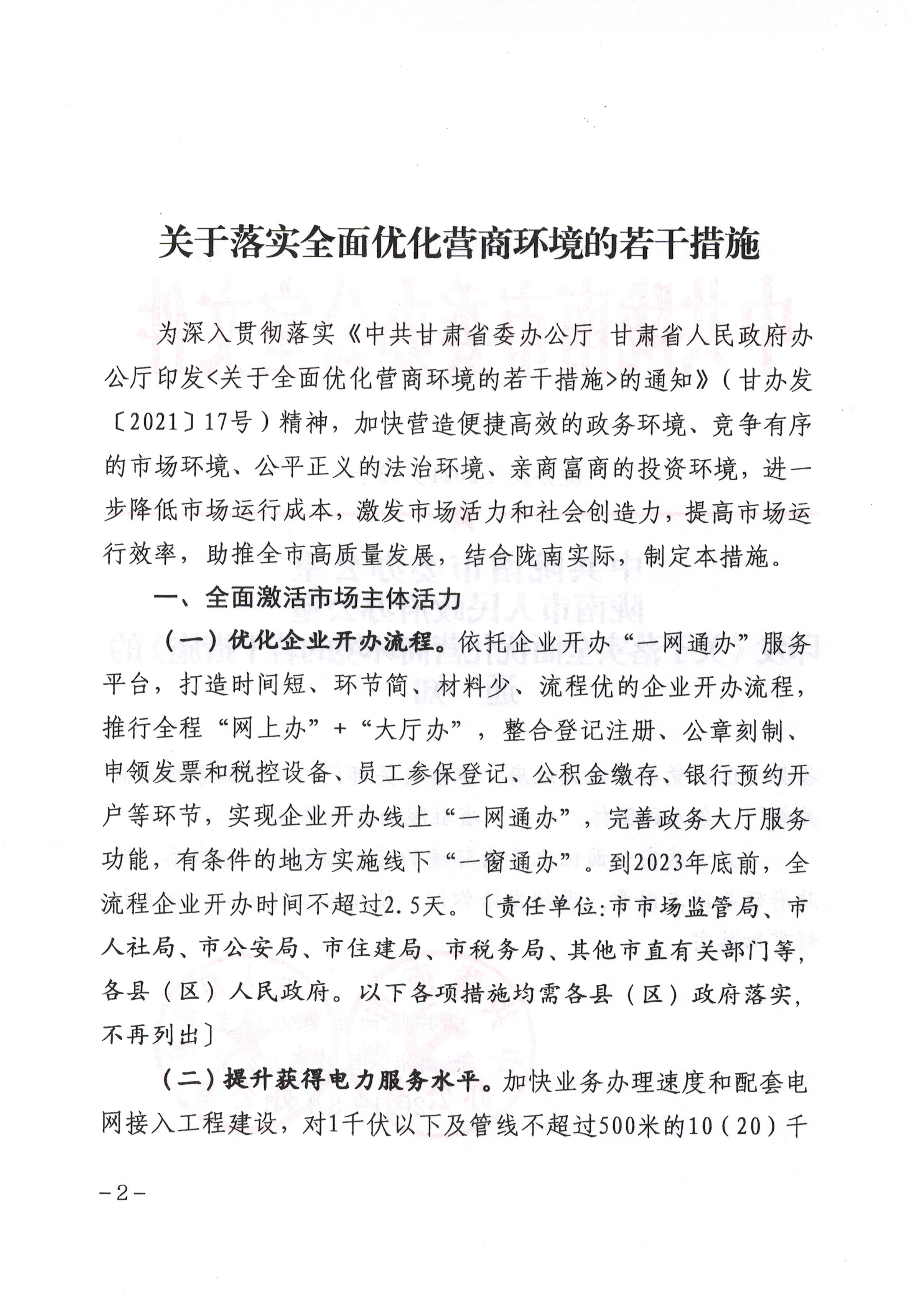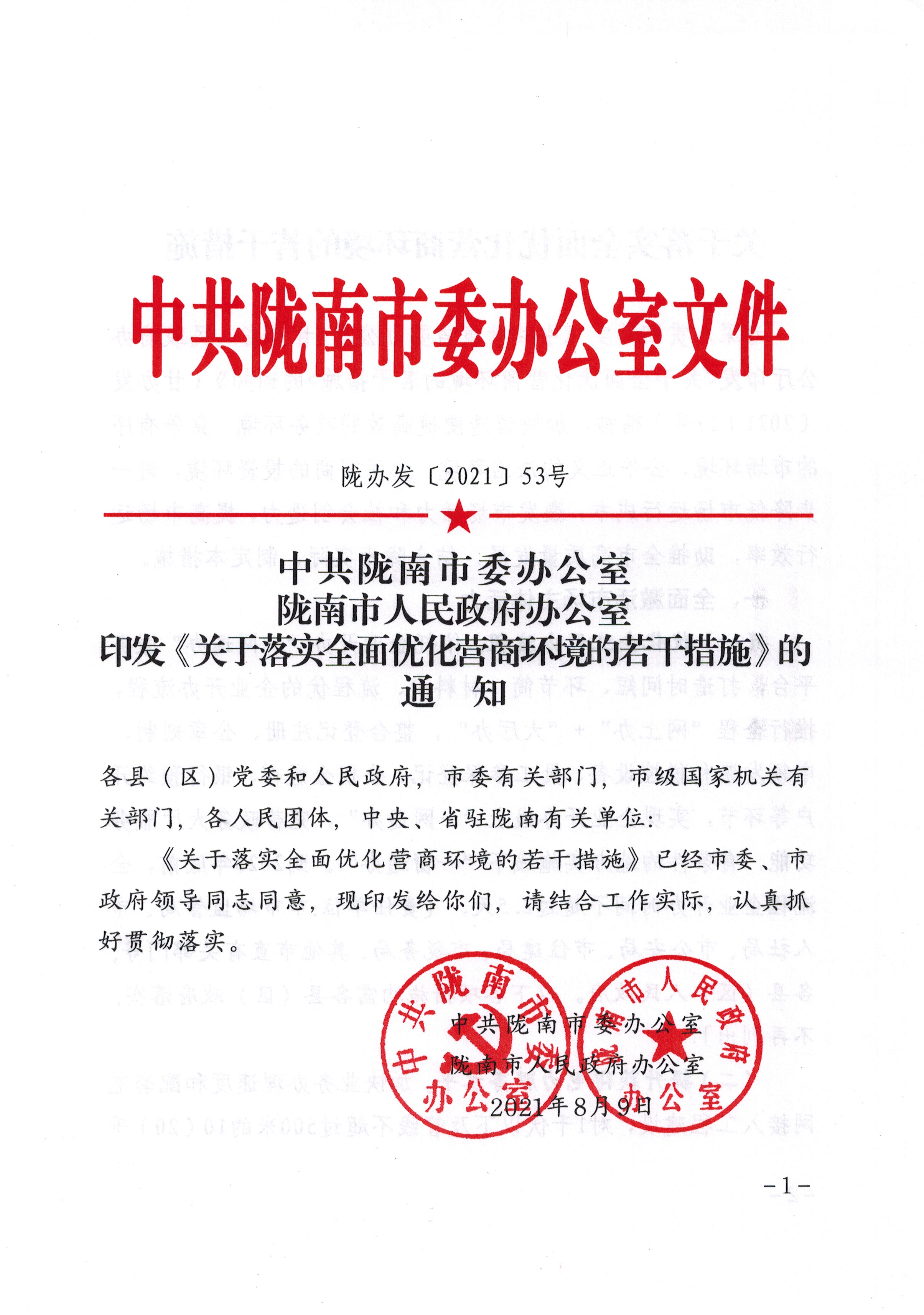中共陇南市委办公室陇南市人民政府办公室印发《关于落实全面优化营商环境的若干措施》的通知