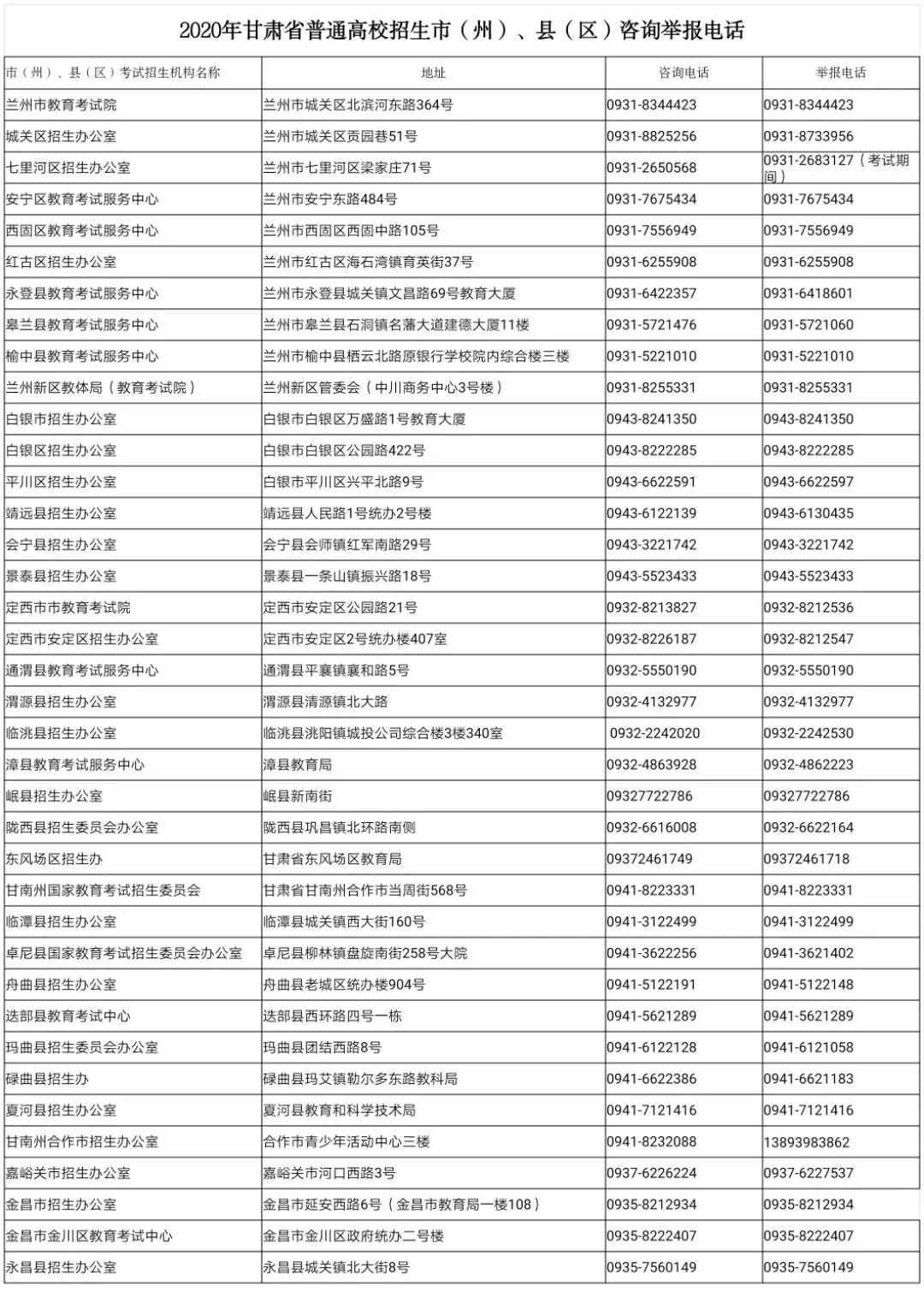 6月30日,甘肃省教育考试院公布了2020年甘肃省普通高校招生市(州)、县(区)咨询举报电话。(掌上兰州·兰州晨报记者 武永明)