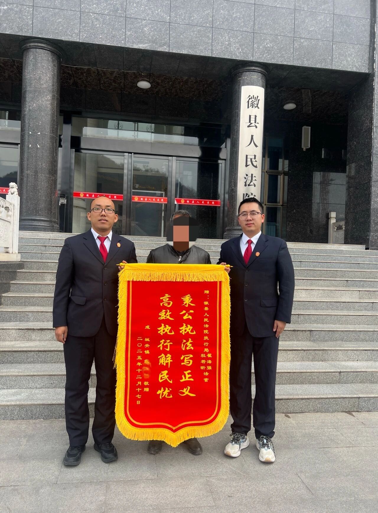 一面锦旗,承载着群众对司法公正的认可;一次跨省执行,彰显了法院破解“执行难”的坚定决心。12月19日,申请执行人武某某专程来到徽县人民法院,将一面印着“秉公执行写正义 高效执行解民忧”的鲜红锦旗送到执行干警手中,再三感谢法院千里奔袭西安,成功找到被执行人,帮他兑现了胜诉权益。